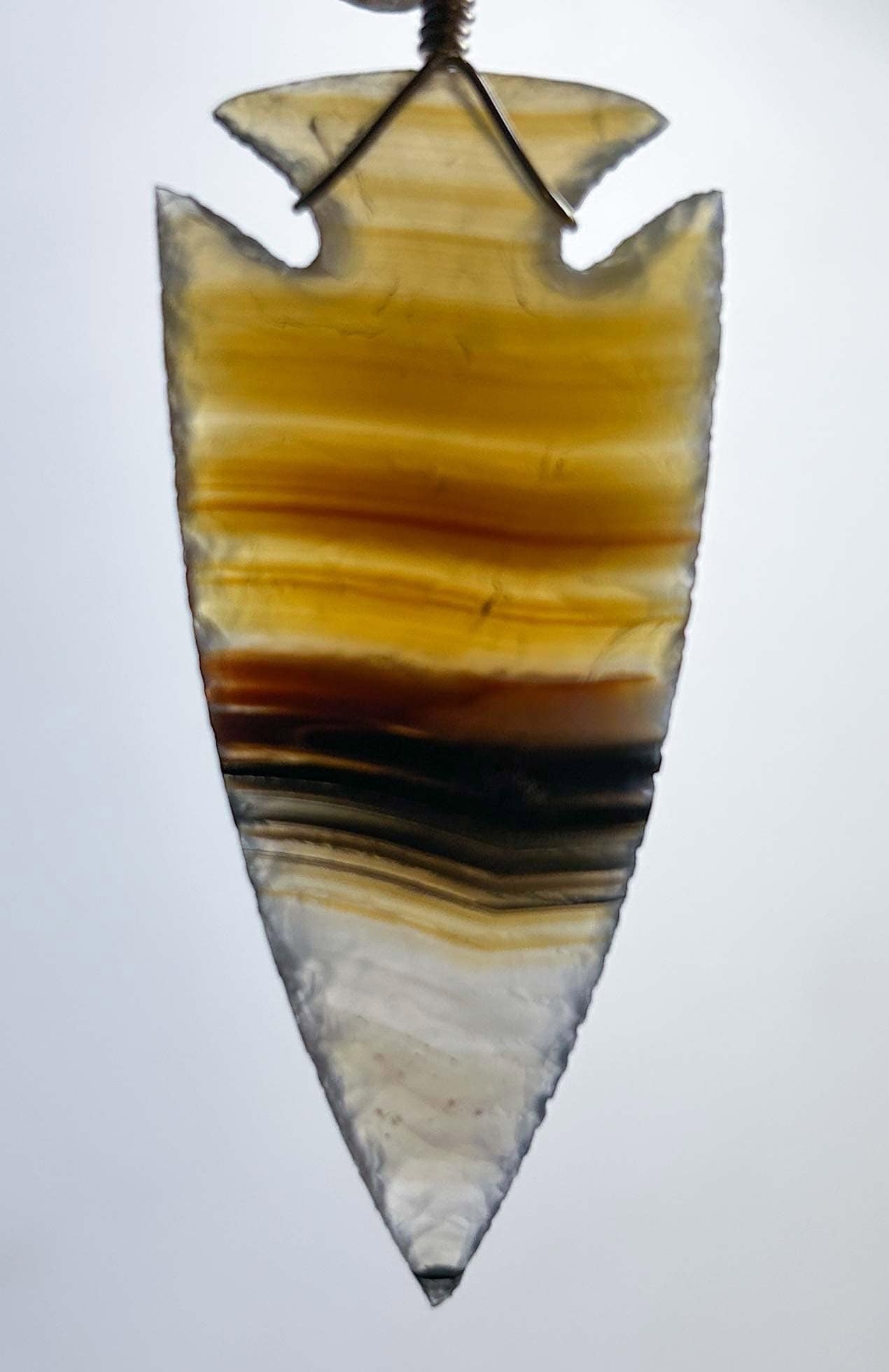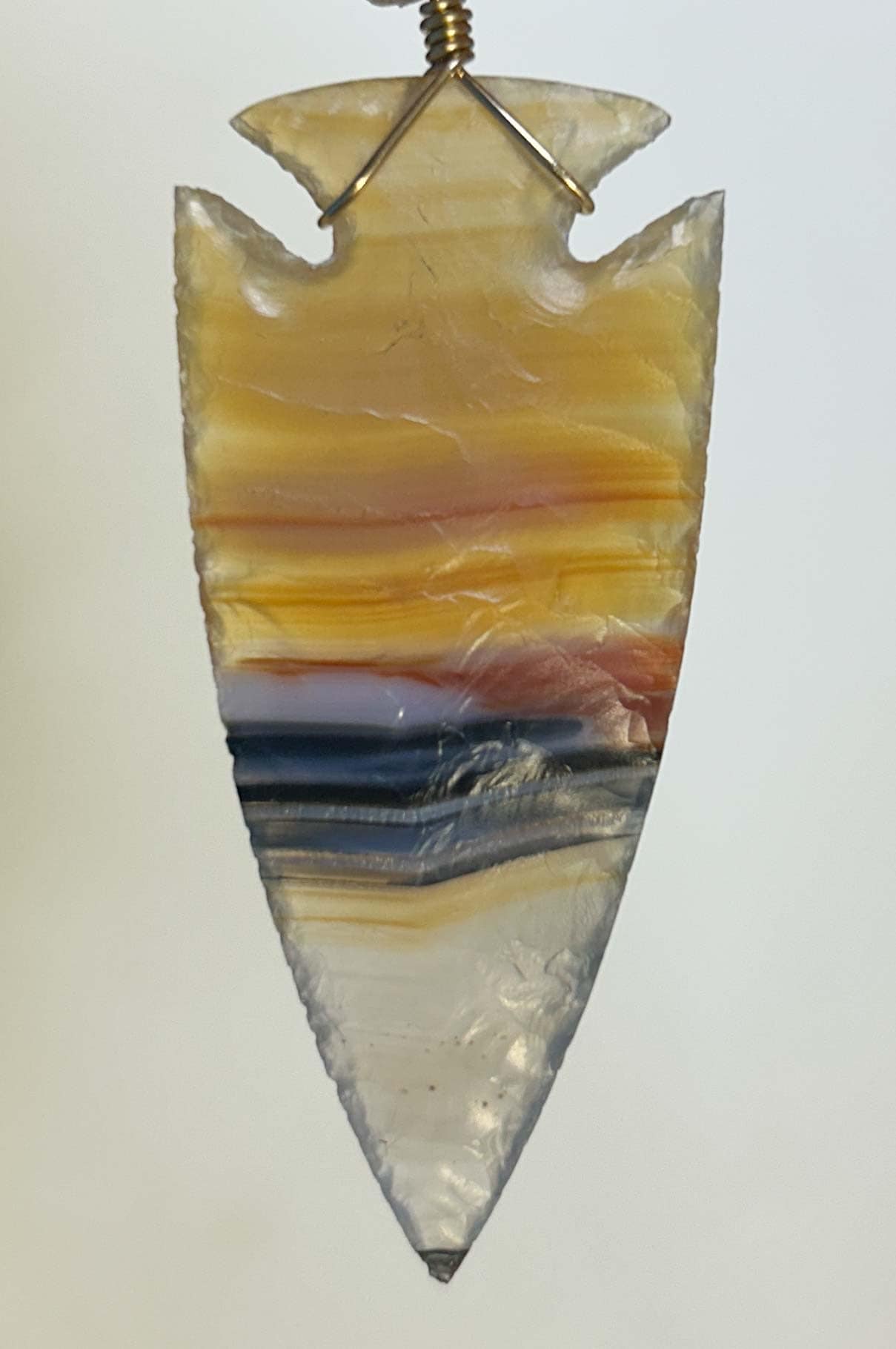 Brazilian Agate is a wonder to behold with it’s gorgeous translucency and eye popping banded patterns within. This 2.25″ flintknapped arrowhead necklace is unique with its multi-colored banding. It’s wrapped with 14k gold-filled wire and comes with a gold plated 18″ chain, as well.