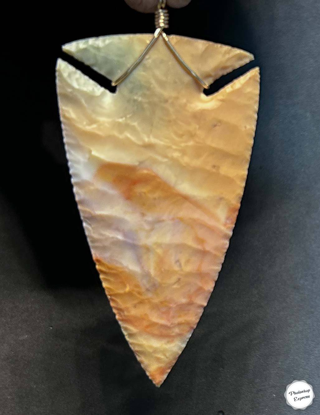 Here’s a one of a kind flintknapped arrowhead pendant, complimented with a 14k gold-filled bail and wire wrap. These pastel colors are beautiful characteristics of this diverse material from Ohio, that was highly prized by prehistoric people for thousands of years. This Arrowhead Pendant measures 2.5″ x 1.4″ and also comes with an 18″ gold plated chain.