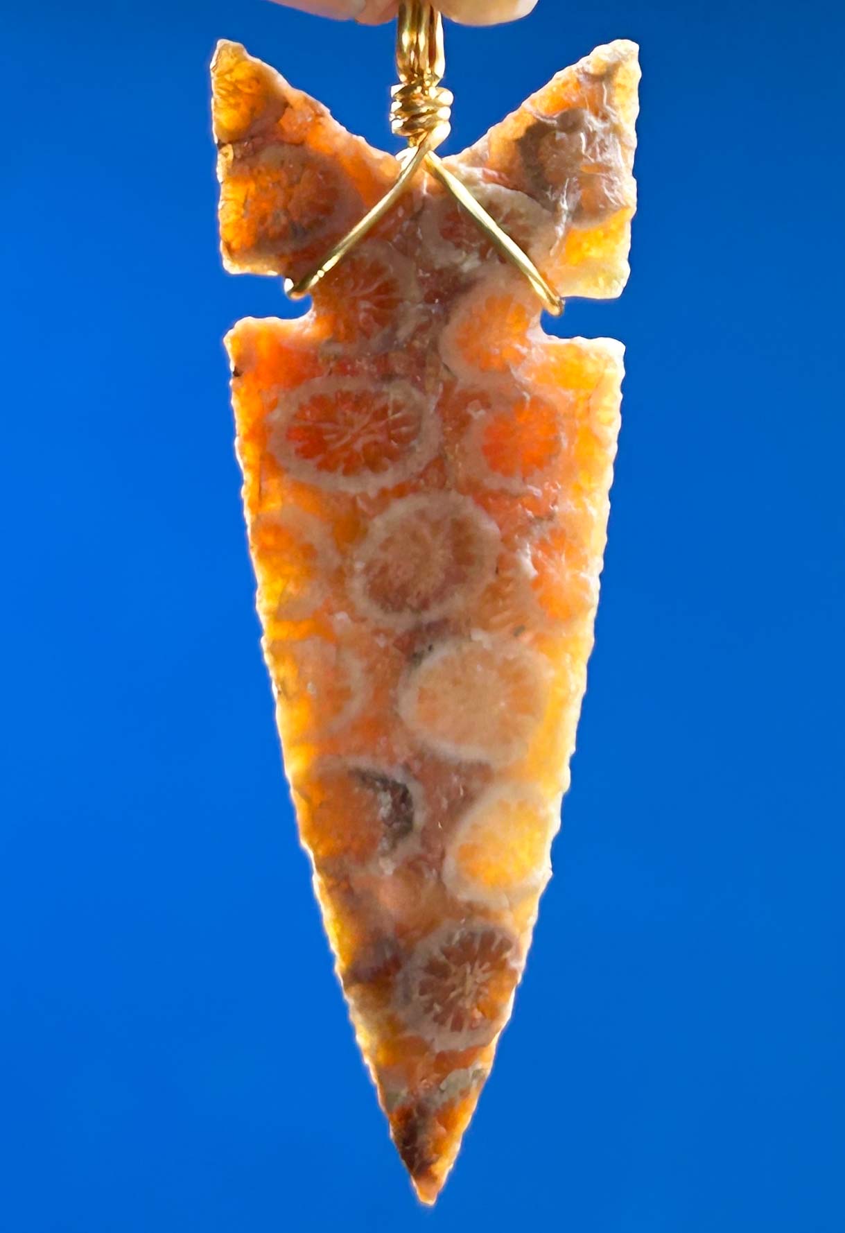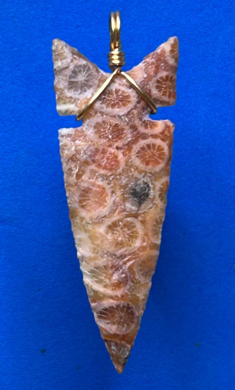 Here’s an 1.75″ arrowhead necklace, knapped from a gorgeous piece of agatized Indonesian coral. It’s an amazing material that was once a living coral colony, eons ago. Now it’s to be worn and enjoyed for its splendid natural beauty.