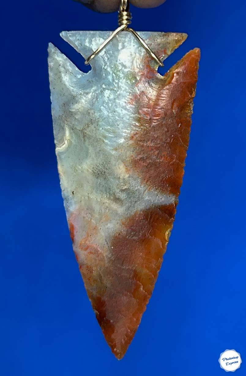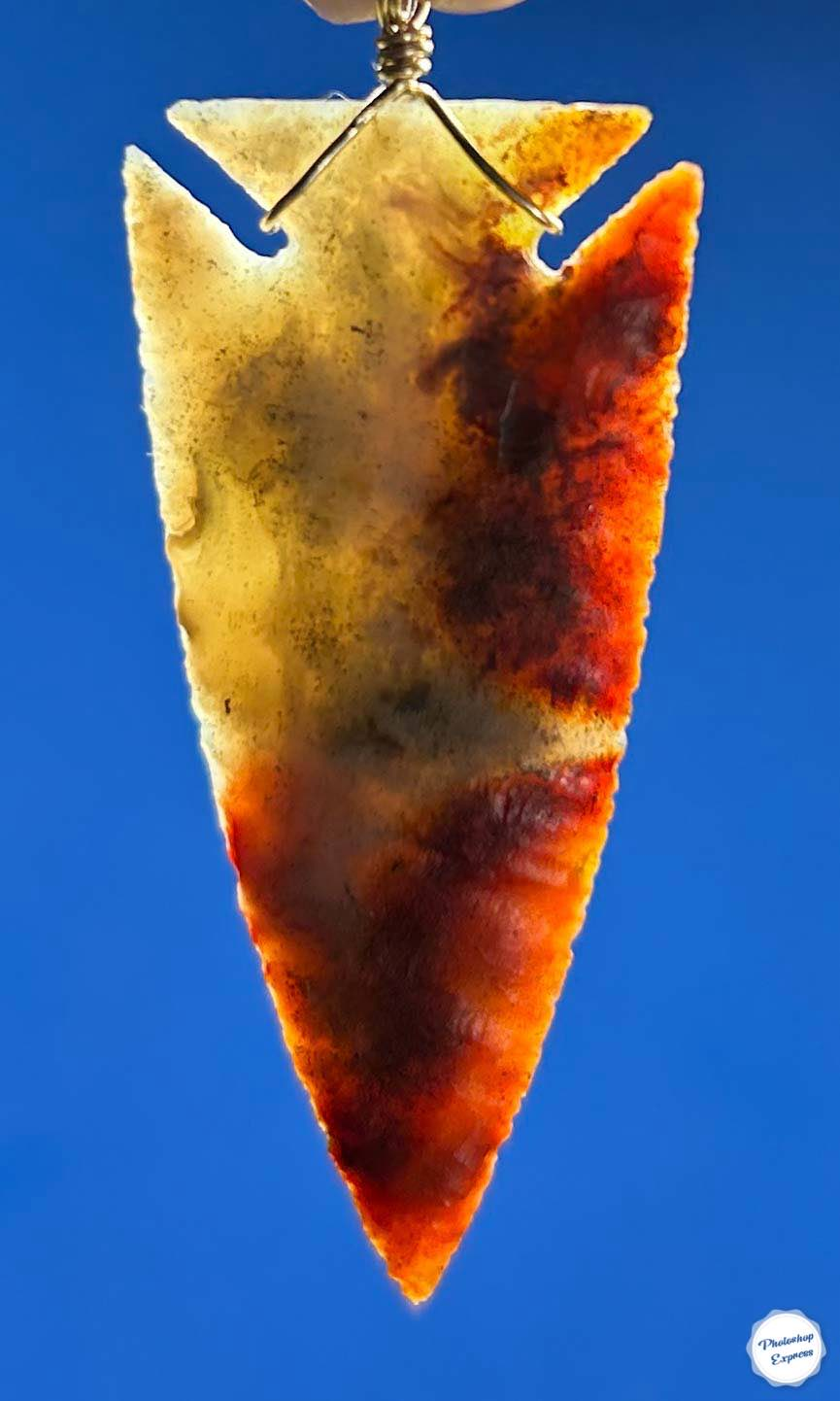 Ocean Wave Agate is a rare material that’s no longer available.  It was found in Madagascar decades ago and mined out in a relatively short time.  This 1.75″ arrowhead necklace is an example of the diverse beauty of Ocean Wave Agate.  The translucency of this point is just one of its visual delights to behold!
