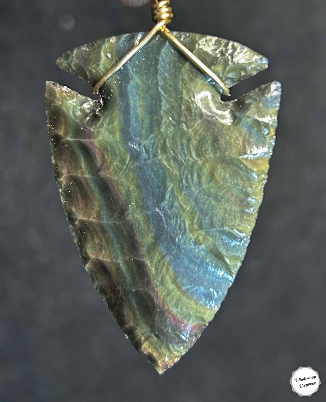 This 1.5″ x 1.2″ arrowhead pendant is knapped from the highest grade of Peacock Obsidian from Jalisco Mexico. The material is not easy to obtain, but it’s worth the effort for this grade. The color intensity and chatoyancy of this point when the light reflects on it, are quite remarkable.  This necklace has a bail of 14k gold-filled wire and comes with an 18″ gold plated chain.