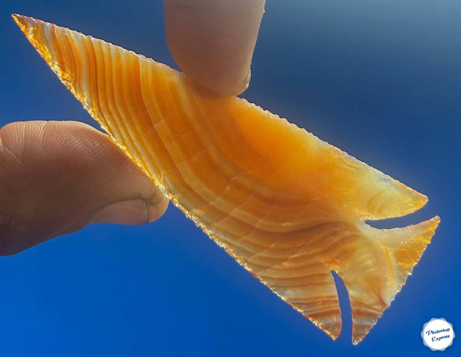 This 3.5″ Brazilian Agate point is what I call an extreme notched arrowhead.  The notches are not only deep but also tapered and gently curved.  Did prehistoric people make notches this narrow?  Rarely if ever, but that doesn’t mean a modern flintknapper can’t push the limits.  The material is also beautifully banded and I call it a Keeper!