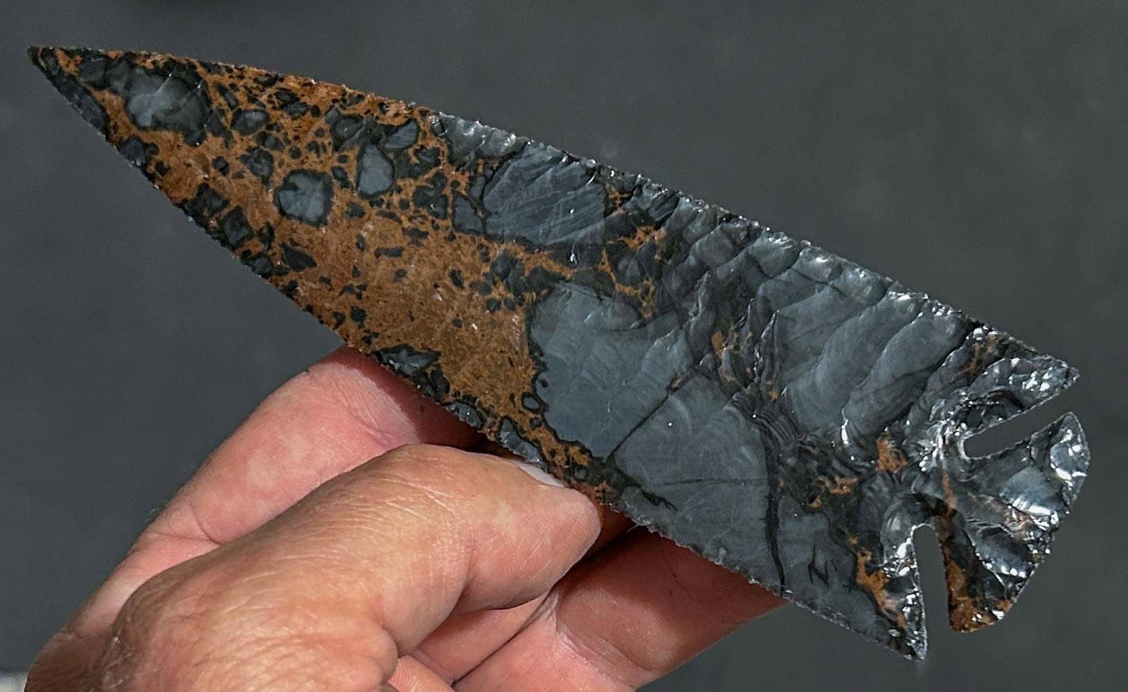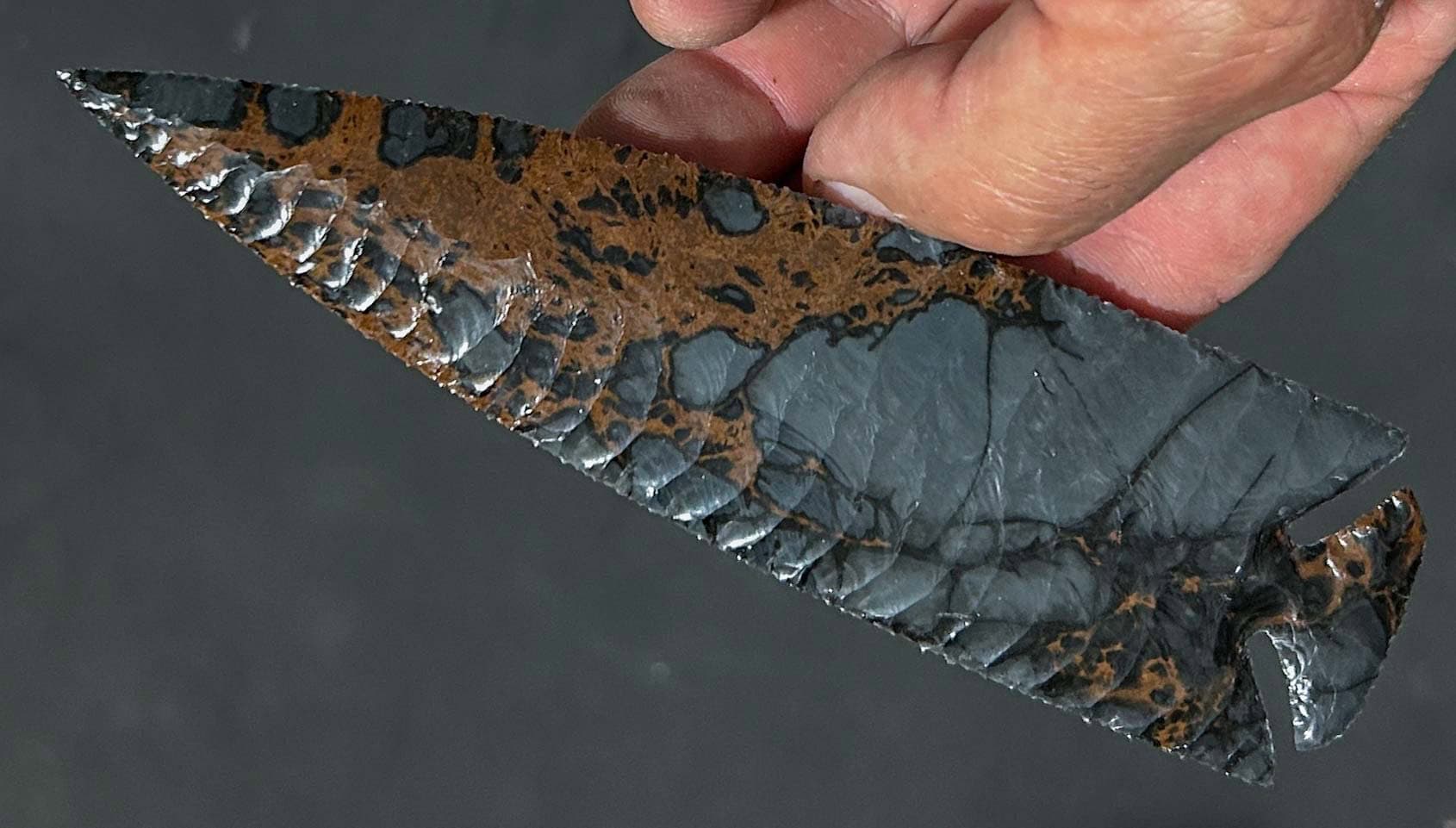 Dragonskin Obsidian from Armenia is unlike any obsidian I’ve knapped. It’s not only somewhat harder than most obsidian, but the patterns within are totally unique. The deposit of this crazy material is expected to run out soon, but I’m hoping they’re wrong! In any case, this sleek but robust, 6″ deep cornernotch point is a fine example of its beauty!