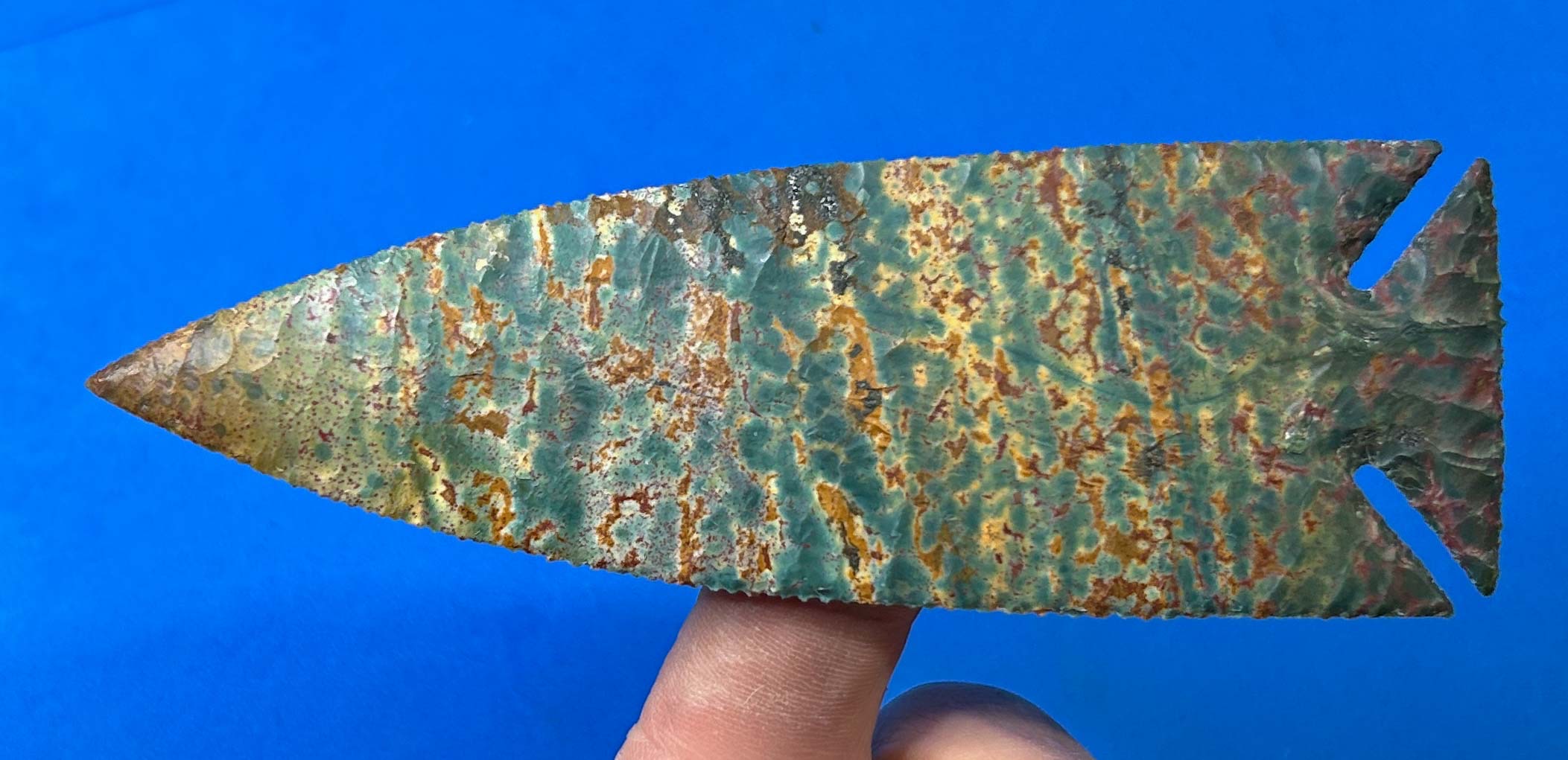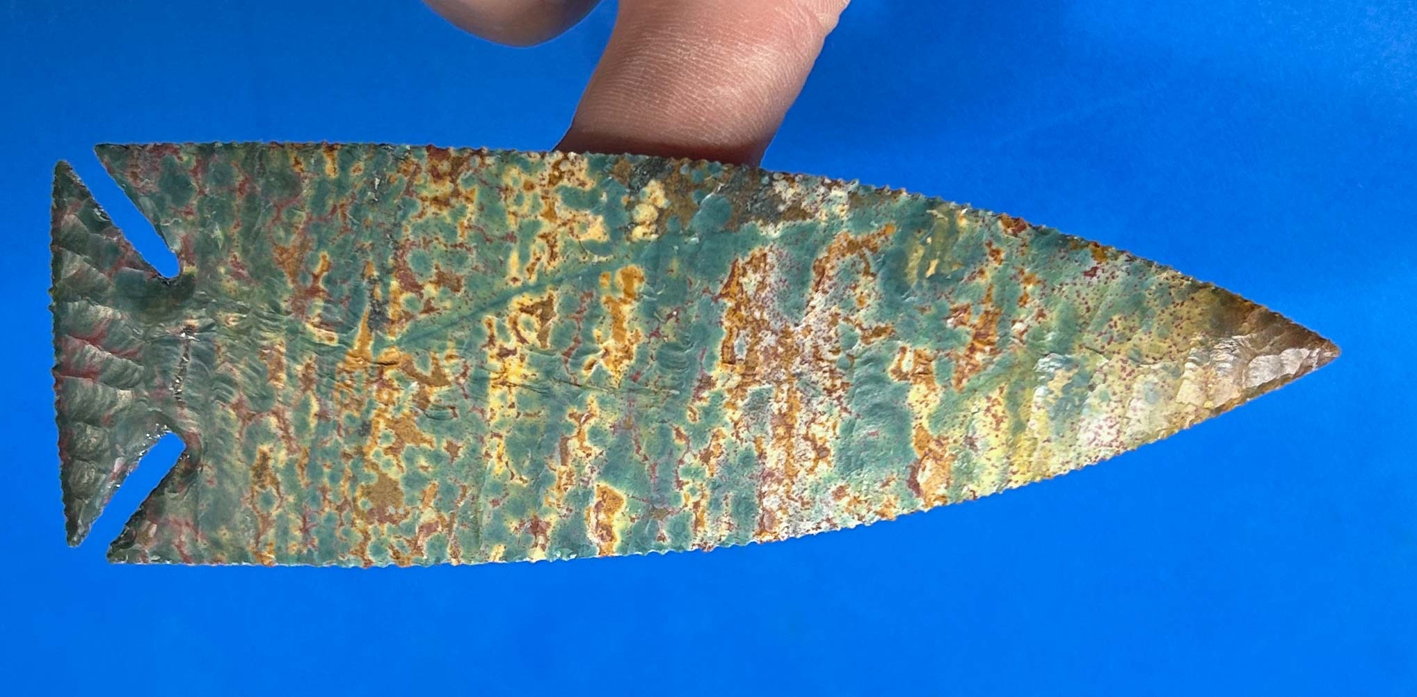Fancy Jasper from India is a highly diverse and beautiful flintknapping material. The colors in this 5″ x 1.75″ lance point are what you could call Camo pattern. Regardless of what this uniquely colored variation of Fancy Jasper is called, I think you’ll agree as to the natural beauty of it.