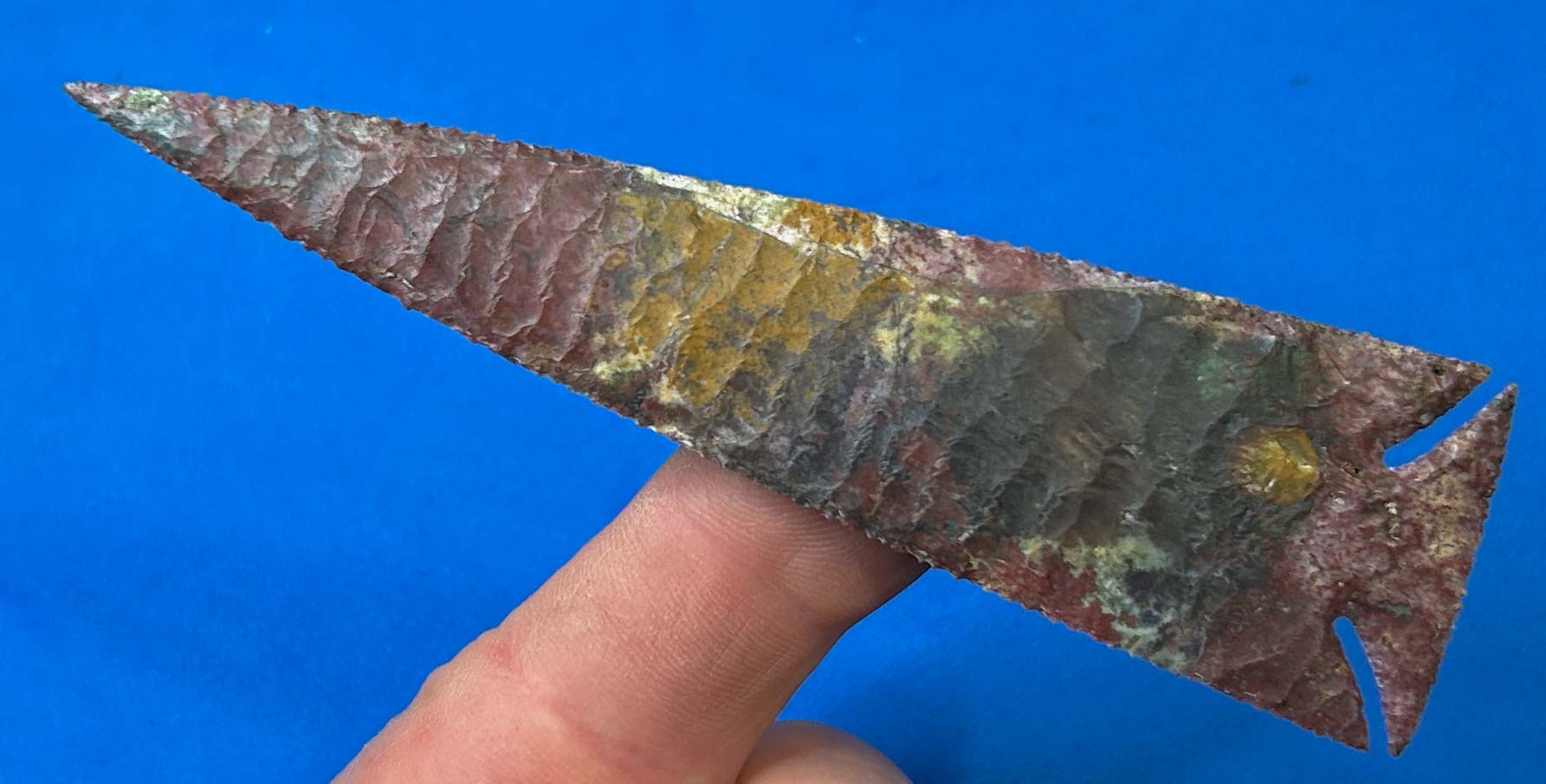 Fancy Jasper from India can be an exceptionally gorgeous flintknapping material and this 4.5″ narrow notched point is made of exactly that.  The colors and pattern of this point combine to compliment the sleek shape of this absolutely unique point.  I think the aboriginal knappers would definitely agree, and I hope you do, too!