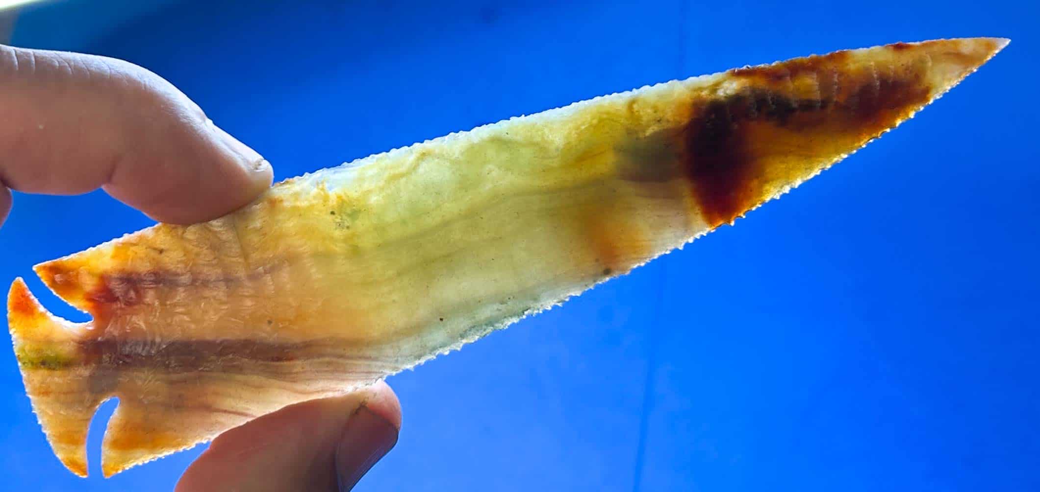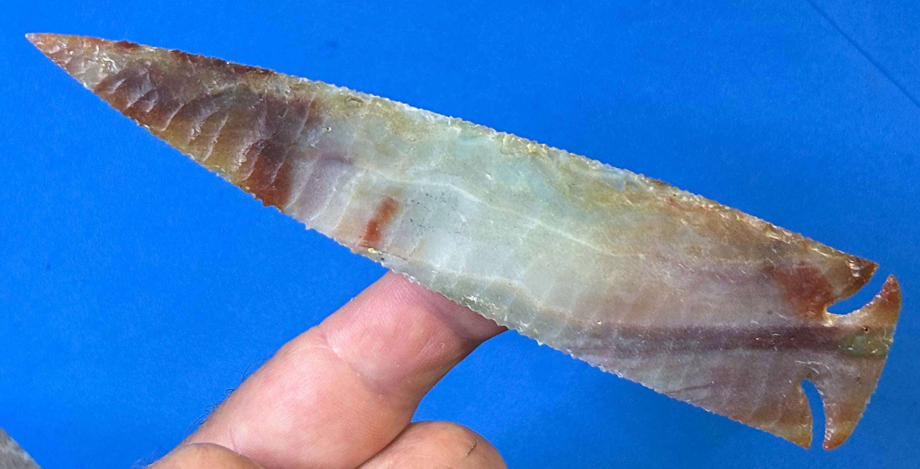 This 6″ point is knapped of some wild, Ocean Wave Agate from Madagascar.  The material hasn’t been available in many years and this piece was hidden in my stash for a long time before recently retrieving it. The final creation turned out rather exceptional in my opinion, with deep dogleg notches. It’s been a keeper that I’ve been enjoying for a while, but it’s time to turn it loose!