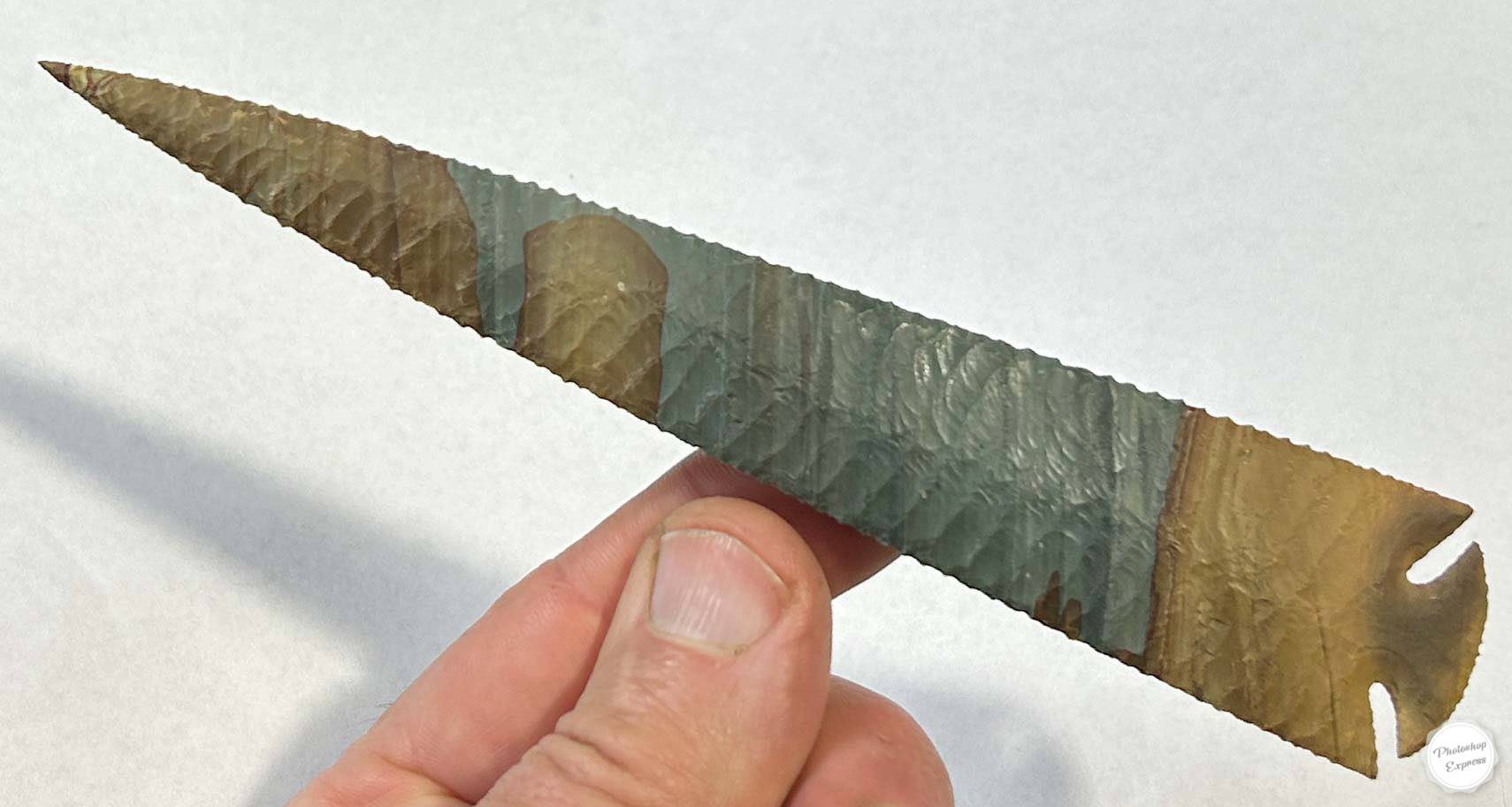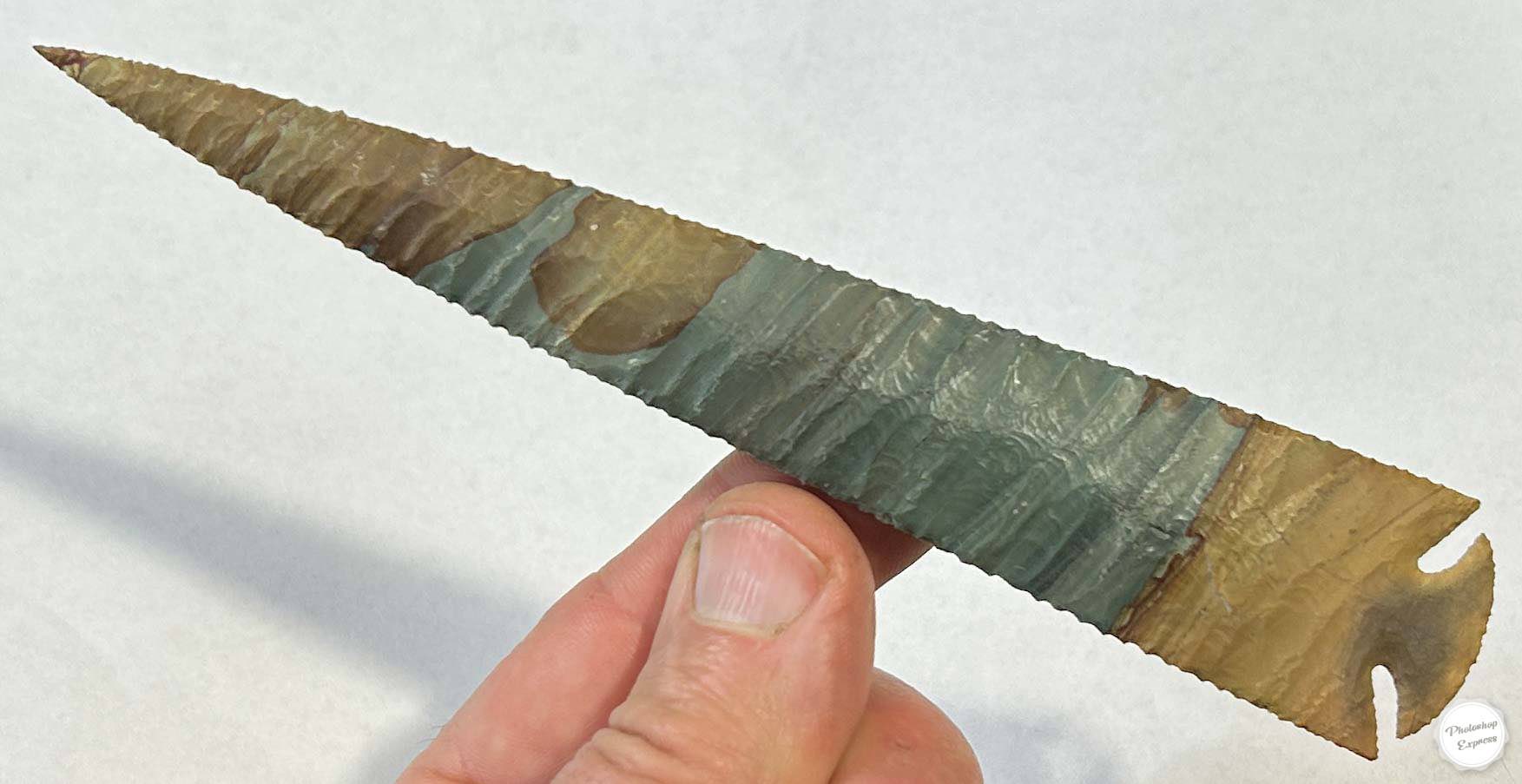 You always know when you have something special when you start flintknapping a piece of rock like this. This 6.75 point is a beautifully colored and patterned piece of Owyhee Jasper from Oregon. Pieces like this are always challenging to knap, captivating to look at.