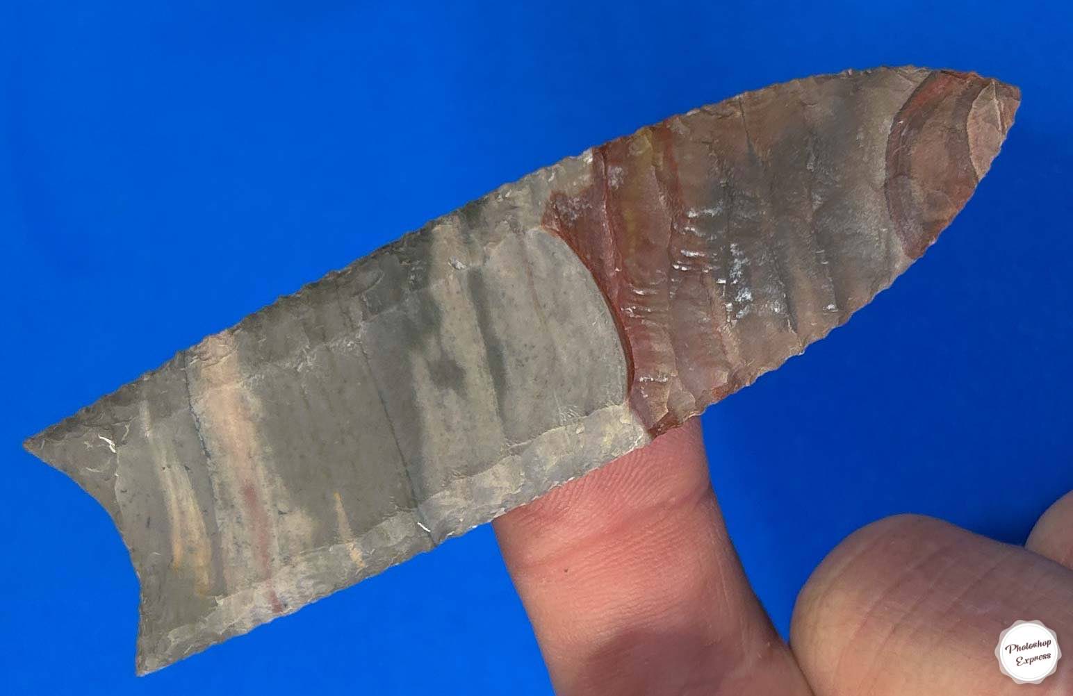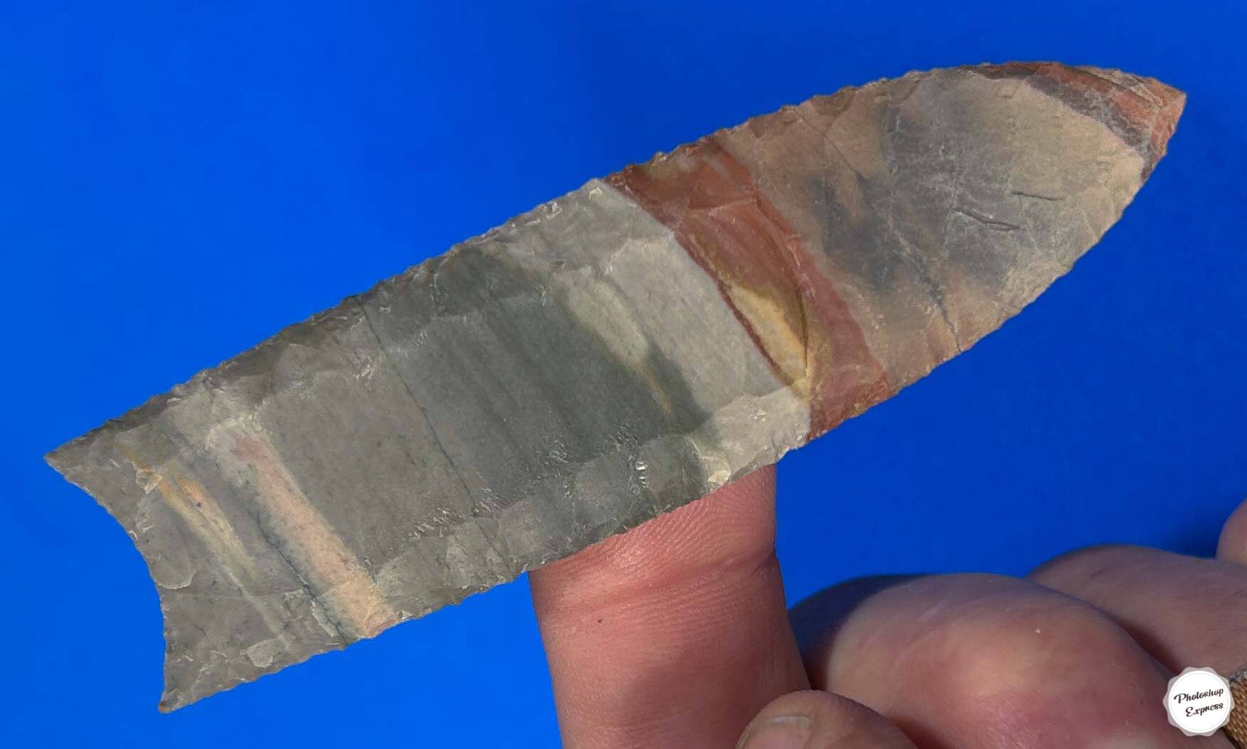 What sets this 3.75″ Polychrome Jasper Clovis Point apart from others? Well, the colors and pattern in this material from Madagascar are gorgeous, and the flutes are exceptional.  I’d like to think that aboriginal Clovis people would have approved and celebrated this one.
