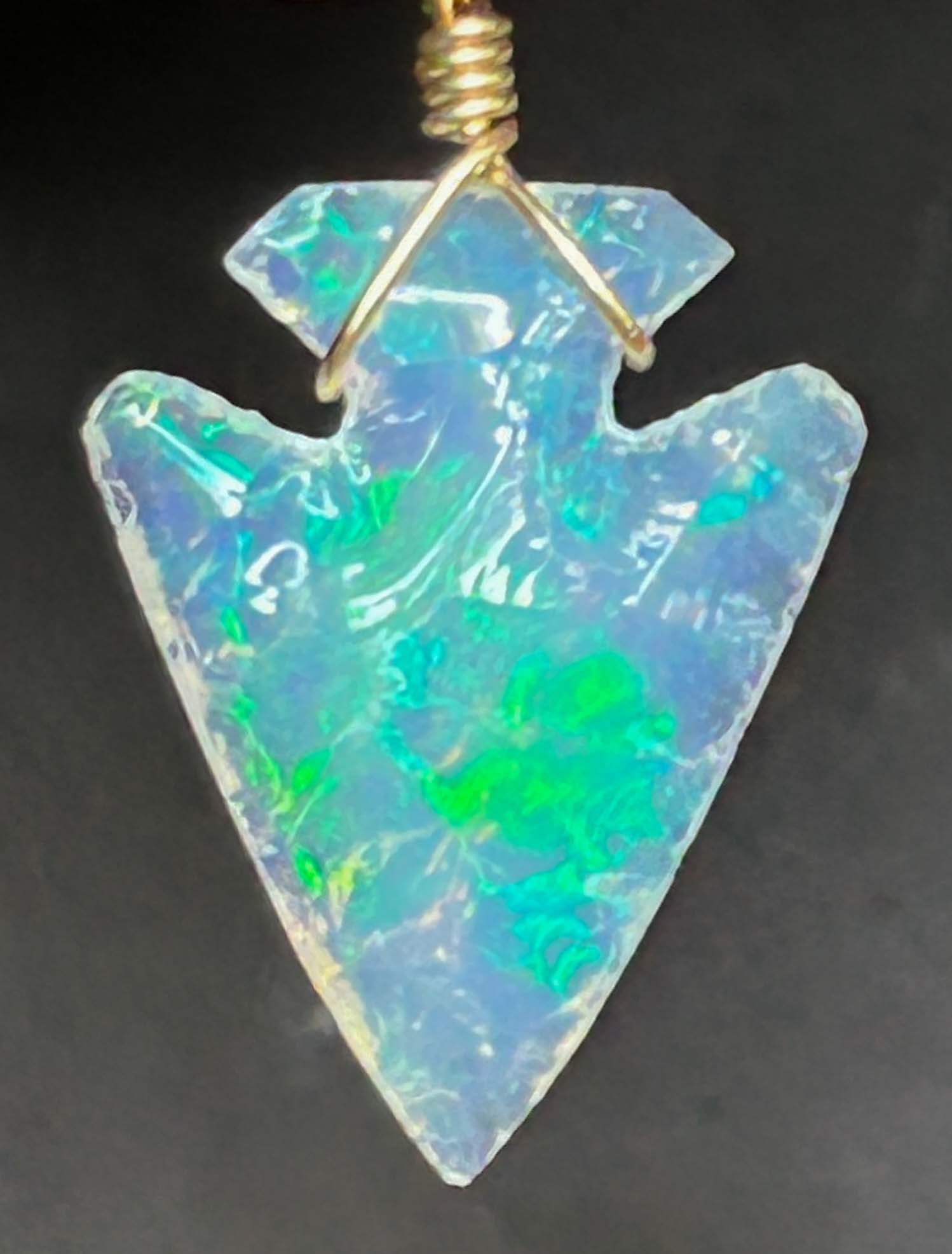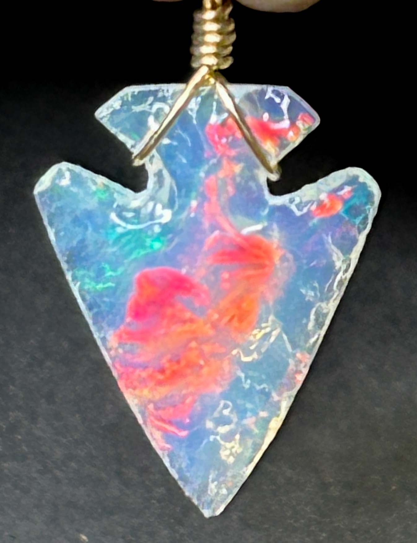 This is a flintknapped Ethiopian Crystal Opal Arrowhead with gorgeous red and green fire displacing each other as the light angle changes. This unique arrowhead is 13/16″ in length, weighs over 3 carats and has intense skin to skin fire, though the opal is amazingly translucent at the same time. It’s a true and rare wonder of nature, and the wire wrap and chain are 14k gold.