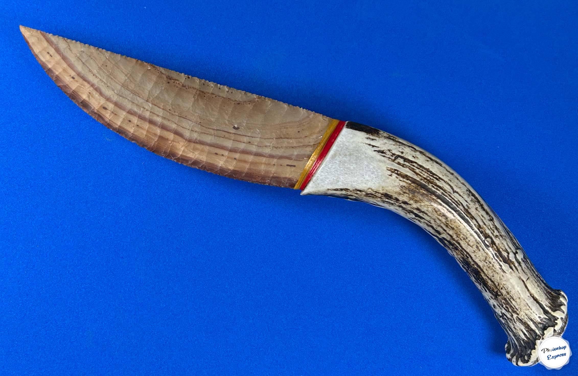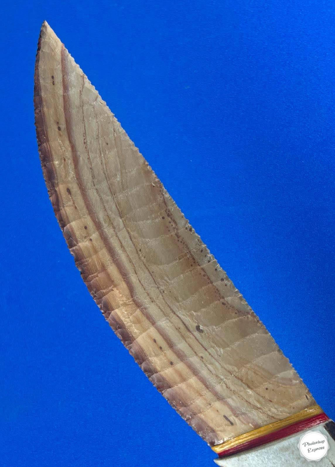 Buffalo River flint is a material I love when it has banding you see here, and this particular piece lends itself so well to the creation of a collectible knife.  This design, that I call the Hunter, has smooth flowing lines and measures 11.5″ with a 6″ blade.  I’ve been enjoying just looking at it for quite a while now, so the time has come for it to find a new fan!